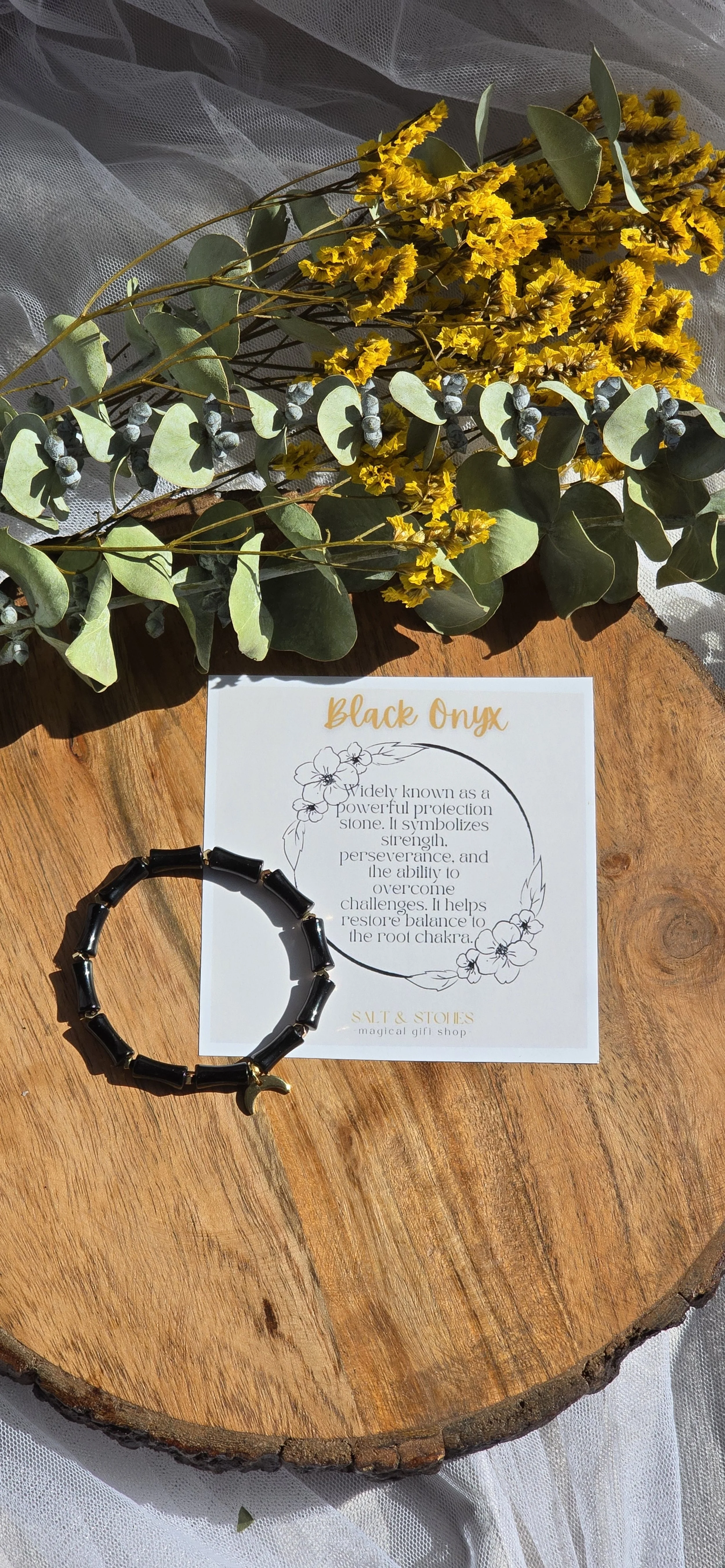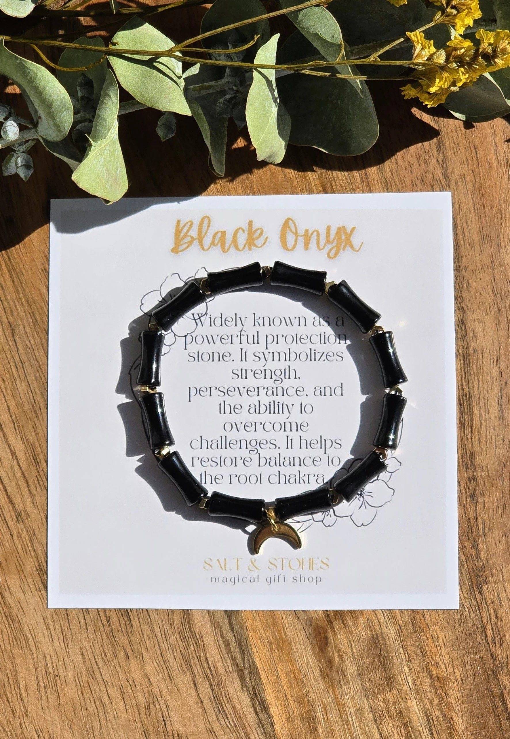 This is a one of kind bracelet made from black onyx gemstone beads on stretch elastic. It has chevron gold tone spacer beads and a crescent moon charm as an accent piece. It measures 16 to 17cm.