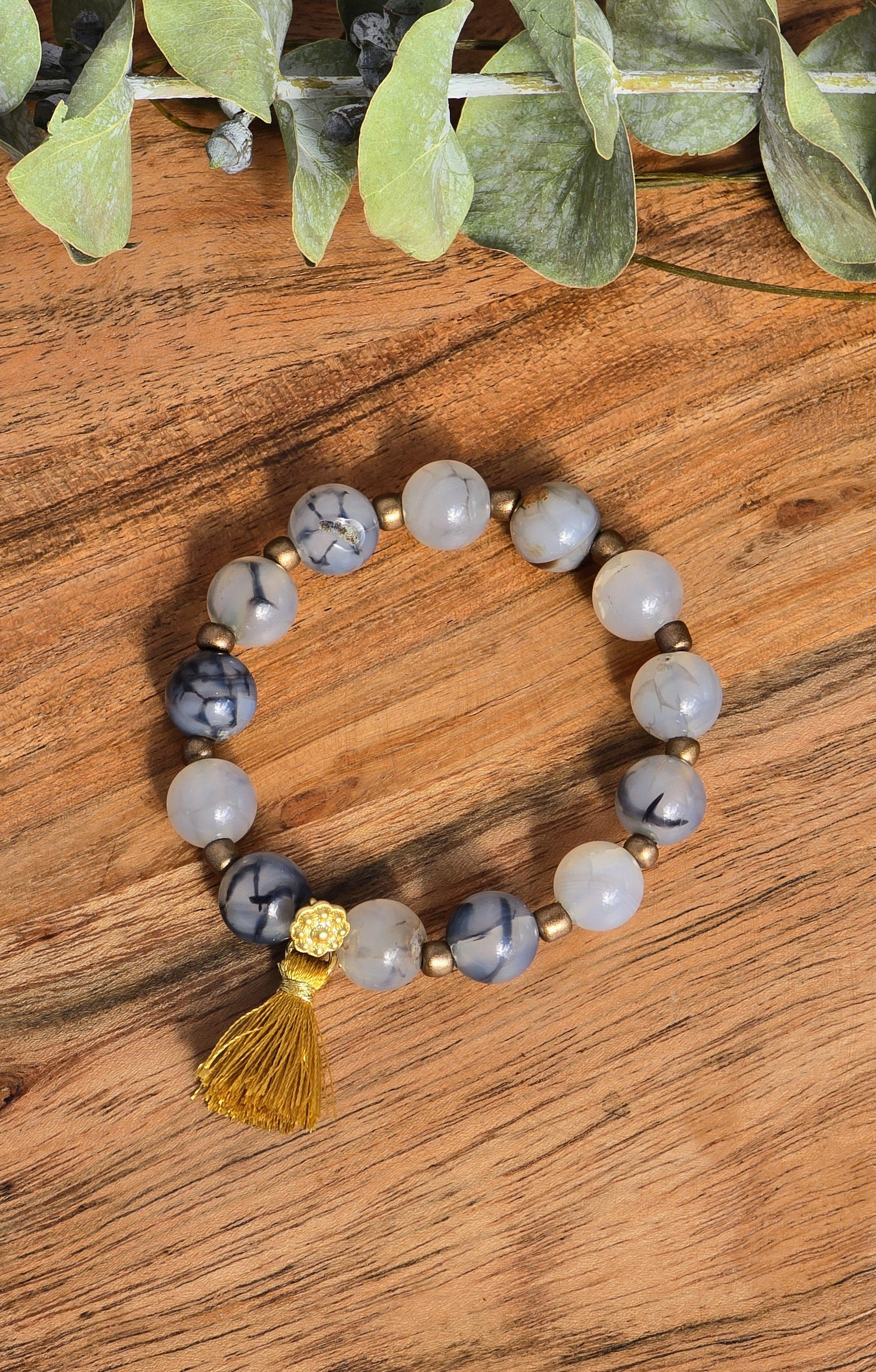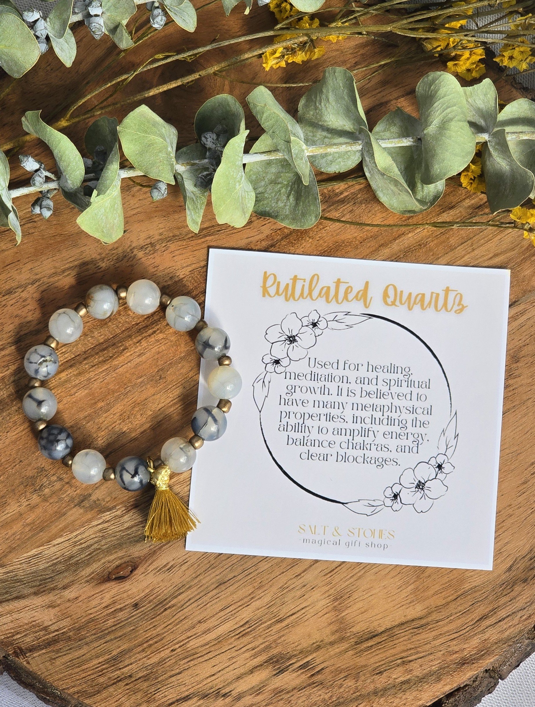 This is a one of kind handmade bracelet with Rutilated Quartz gemstone beads on stretchy string. It has a golden color tassel and lotus flower charm as accent pieces. It measures 14 to 15cm.