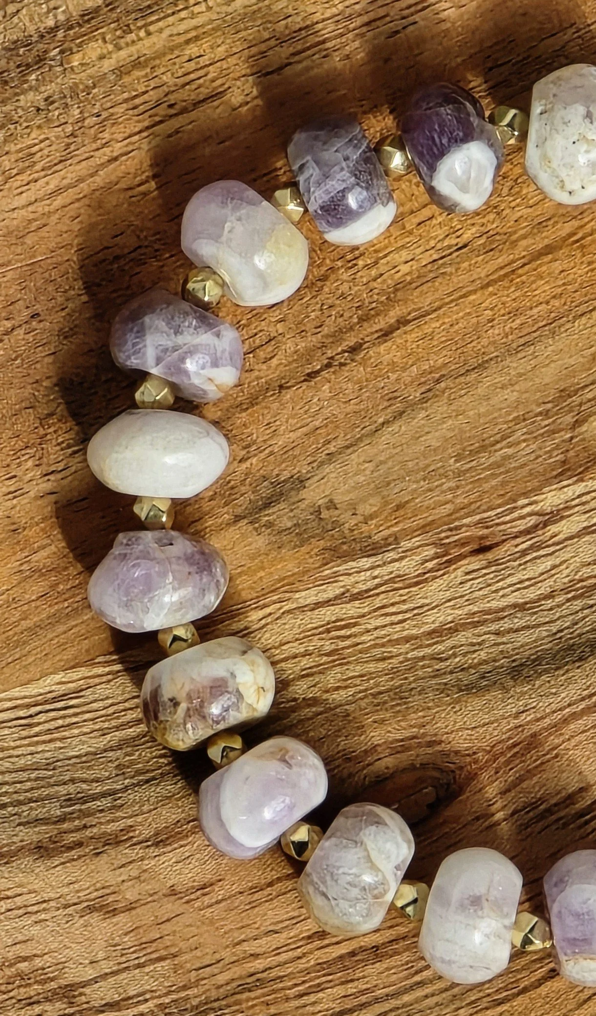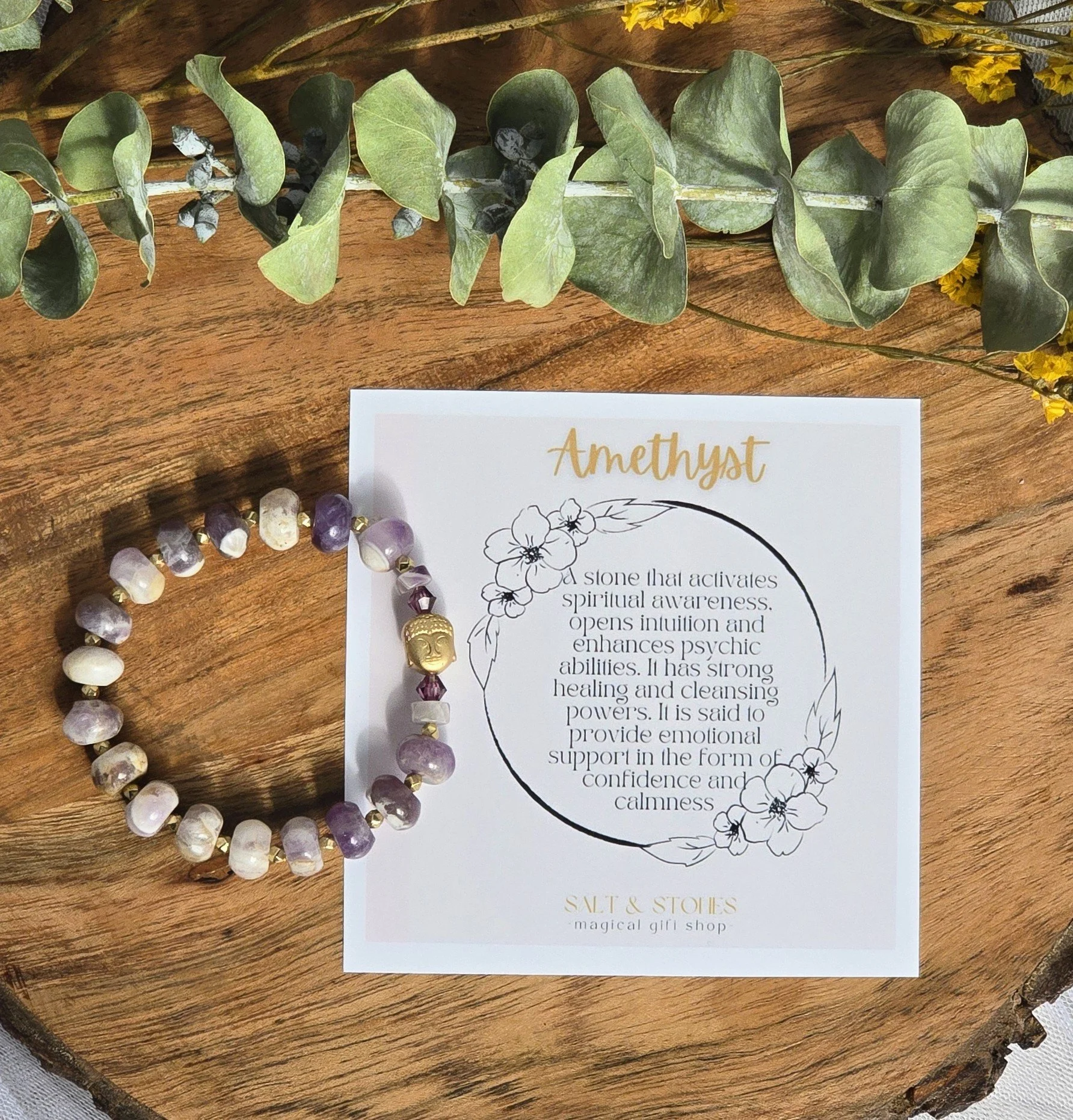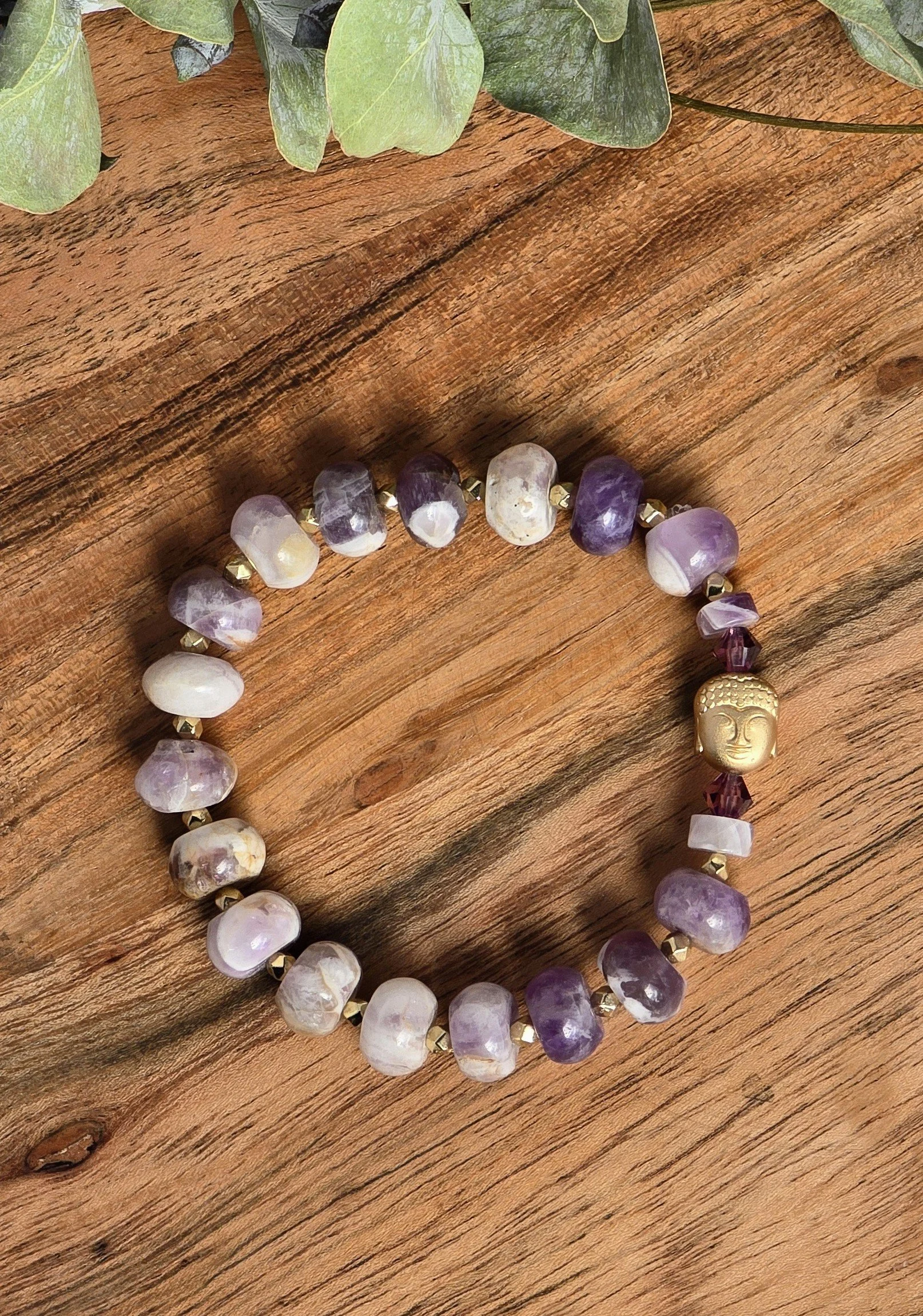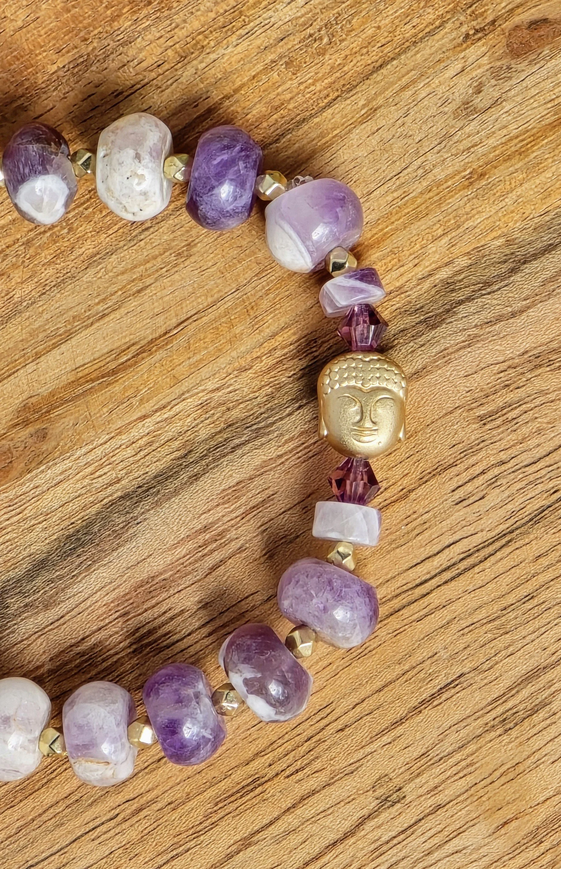 This is a one of kind braclet made from Amethyst gemstone beads on stretchy string. There is a golden color budda head as a focal point. It measures 15 to 17cm.