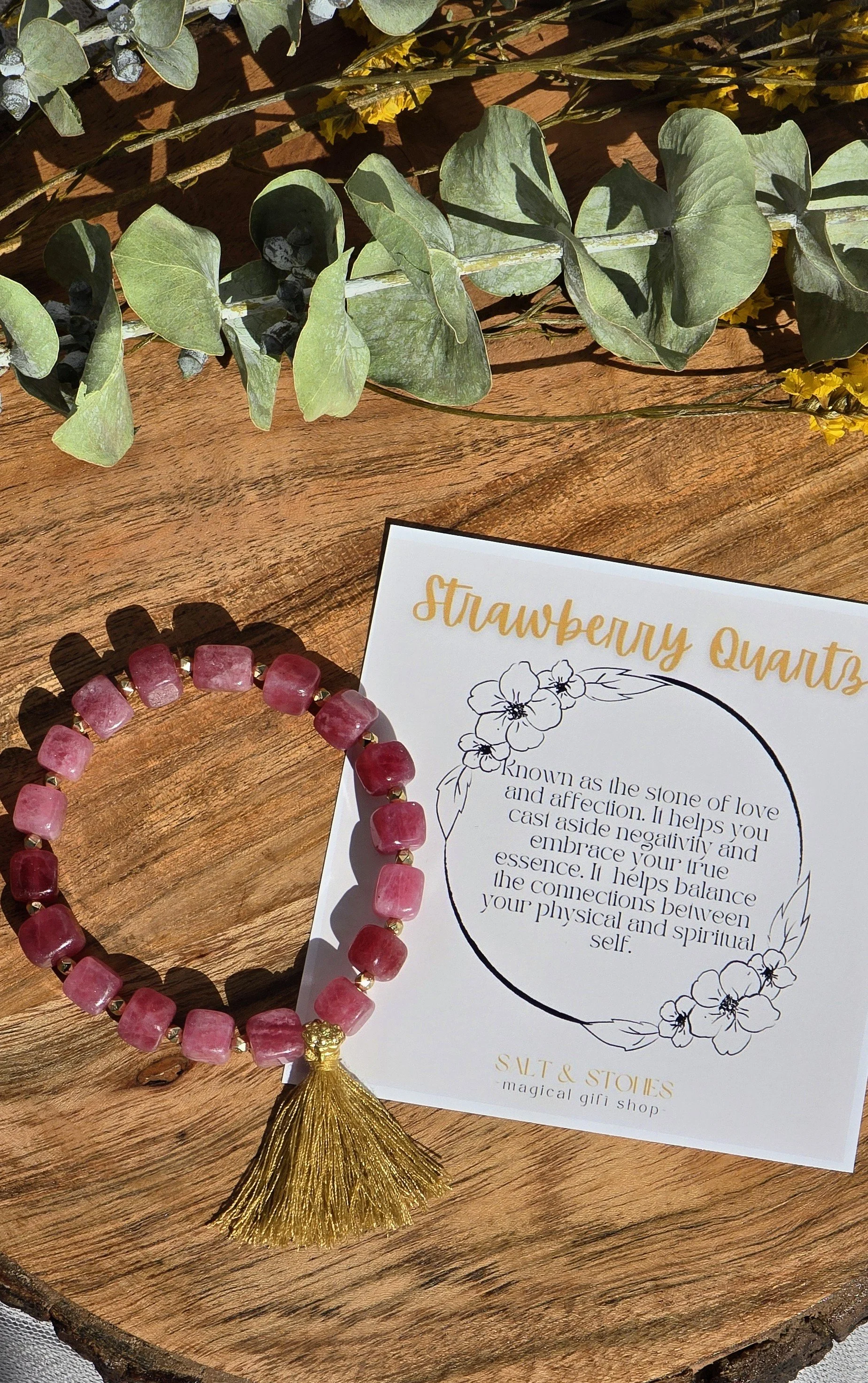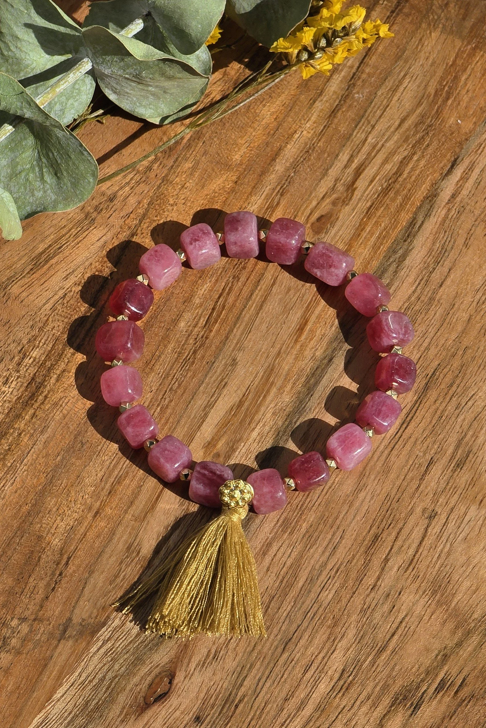 This is a one of kind braclet made from Strawberry Quartz gemstone beads on stretchy string. It has an golden color lotus flower and tassel as accent pieces. It measures 17 to 18cm.